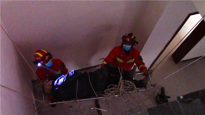 了解情況后,4名消防員立即深入地下室,利用擔(dān)架,先將老人保持原有姿勢(shì)轉(zhuǎn)移到擔(dān)架上,再用救援繩將老人綁在擔(dān)架上加以固定。最后,救援人員將擔(dān)架四角分別綁上救援繩,下方人員托扶擔(dān)架,上方人員將擔(dān)架平穩(wěn)的向上拉。經(jīng)過近30分鐘緊張救援,成功將被困老人救出,并交由醫(yī)護(hù)人員進(jìn)行下一步處理。②10