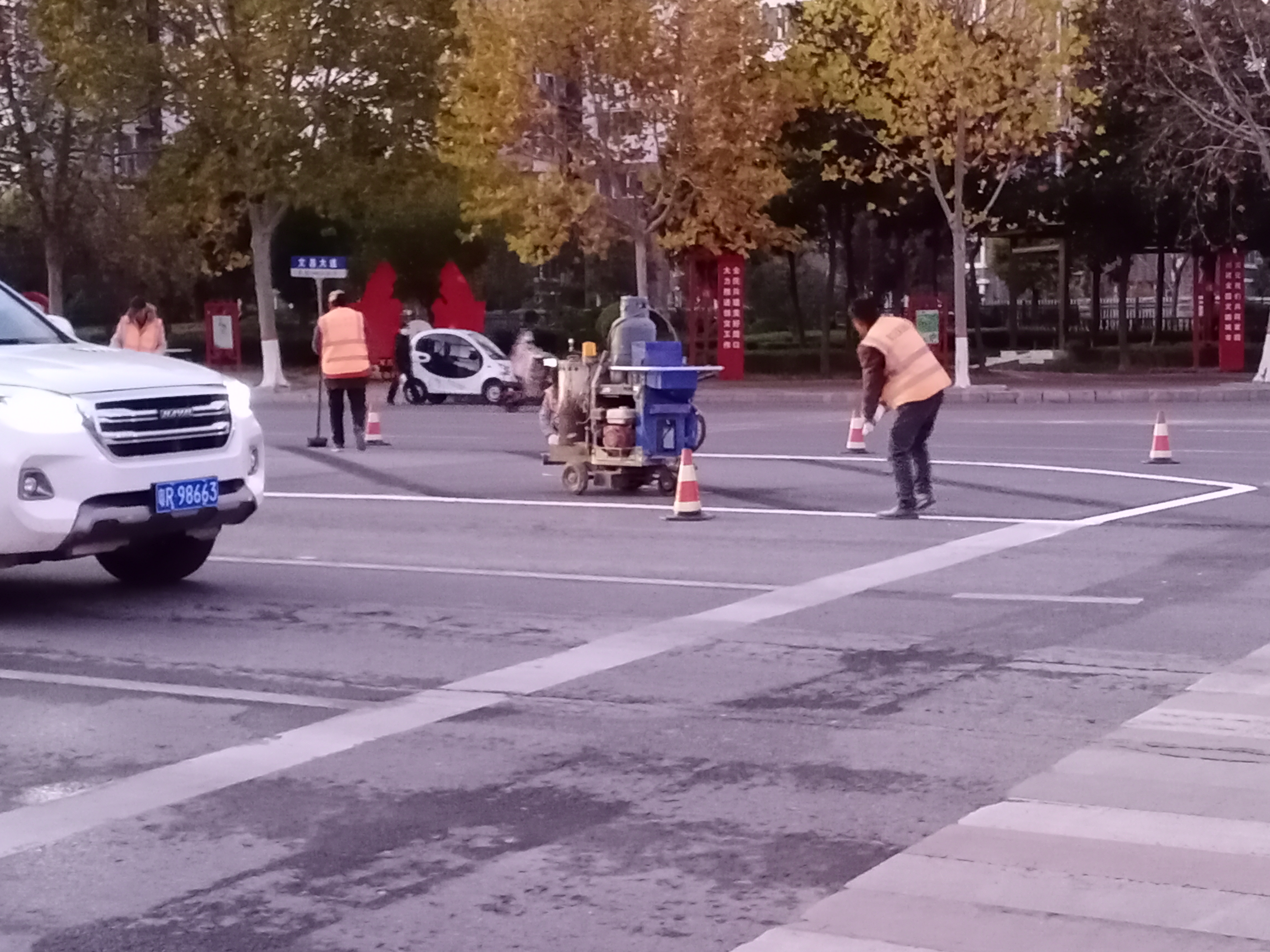 11月9日17時許,記者在周口市中心城區(qū)文昌大道與中原路交叉口看到,施工人員正在對交叉路口上的交通標(biāo)志線進(jìn)行施劃,規(guī)范車輛和行人通行秩序,保證交通安全暢通有序,方便群眾出行。③3記者 張洪濤 攝