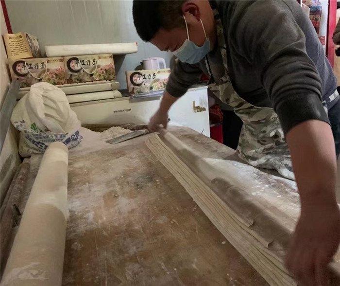 此時(shí),固墻鎮(zhèn)集市最低溫度為零攝氏度,40歲的王永強(qiáng)卻汗流浹背。他,正在自家面館里忙得熱火朝天。從14歲起,王永強(qiáng)就跟著表哥學(xué)習(xí)做手搟面,到現(xiàn)在已有26年的制作經(jīng)驗(yàn)?!斑^年這段時(shí)間一天搟10小時(shí)以上,能出個(gè)七八百碗,就這都賣不及?!蓖跤缽?qiáng)邊說邊做準(zhǔn)備工作,只見他將一盆醒好的、重40斤,用高筋面粉和鹽和好的面團(tuán)鋪在案板上,拿出一根一米五長的鐵棍將面團(tuán)按壓平整,再用有十幾年歷史的搟面杖,邊鋪撒玉米淀粉、邊用力搟。1個(gè)小時(shí)后,面團(tuán)被搟至薄皮狀,最后按層折疊鋪好,用快刀切成相等寬度,撣走多余面粉,挽成麻花狀。如此,遇水不散、出水不沾、溫潤光滑、筋而不膩的固墻手搟面就完成了。固墻手搟面最常見的做法是用大火多水煮沸后,撈起配以番茄雞蛋、蒜泥黃瓜,拌勻后享用。夾起一筷子面條,觀其形如玉帶臨風(fēng),察其色若飛雪粼粼,送入口中品其味,則似玉蘭入口,真是美哉!爽哉!