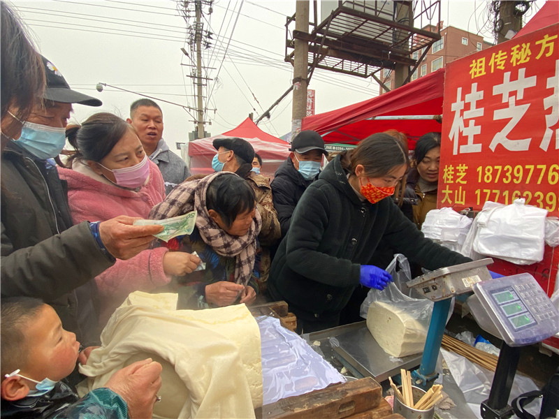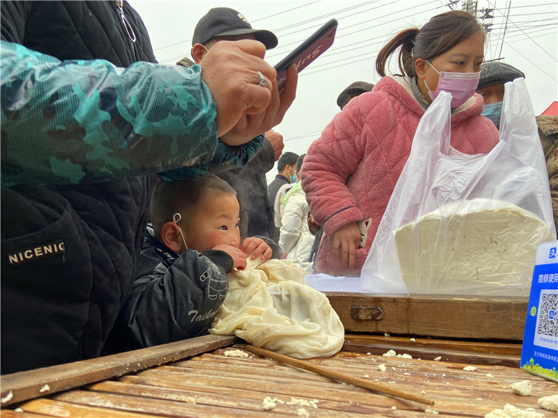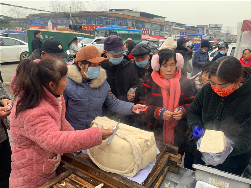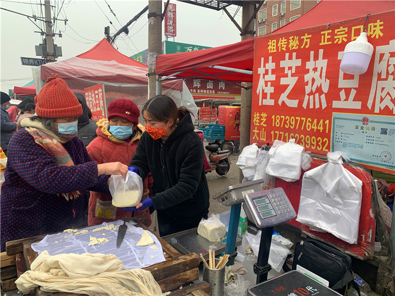在固墻鎮(zhèn)的集市上,“桂枝熱豆腐”攤位前的顧客絡繹不絕?!敖o我來50塊錢的豆腐”“我要20斤,先給我切豆腐吧”“我要30斤,多少錢”……人群將豆腐攤里三層外三層圍了起來,從人群外朝里看看不見豆腐,只看到豆腐攤里冒出來的團團熱氣?!暗攘税雮€小時了,剛才那一盒豆腐沒輪到我就賣完了,這才搶到手?!备浇拇迕駰畲鬆斈弥鴦傎I的豆腐高興地說。“我從鹿邑來的,姐姐在里面擠著買豆腐,我在這兒等她呢?!?歲的張家瑞說,她每年放寒假都會和家人一起到固墻來探親,過年的時候逛逛集市,順便買些豆腐帶回鹿邑。