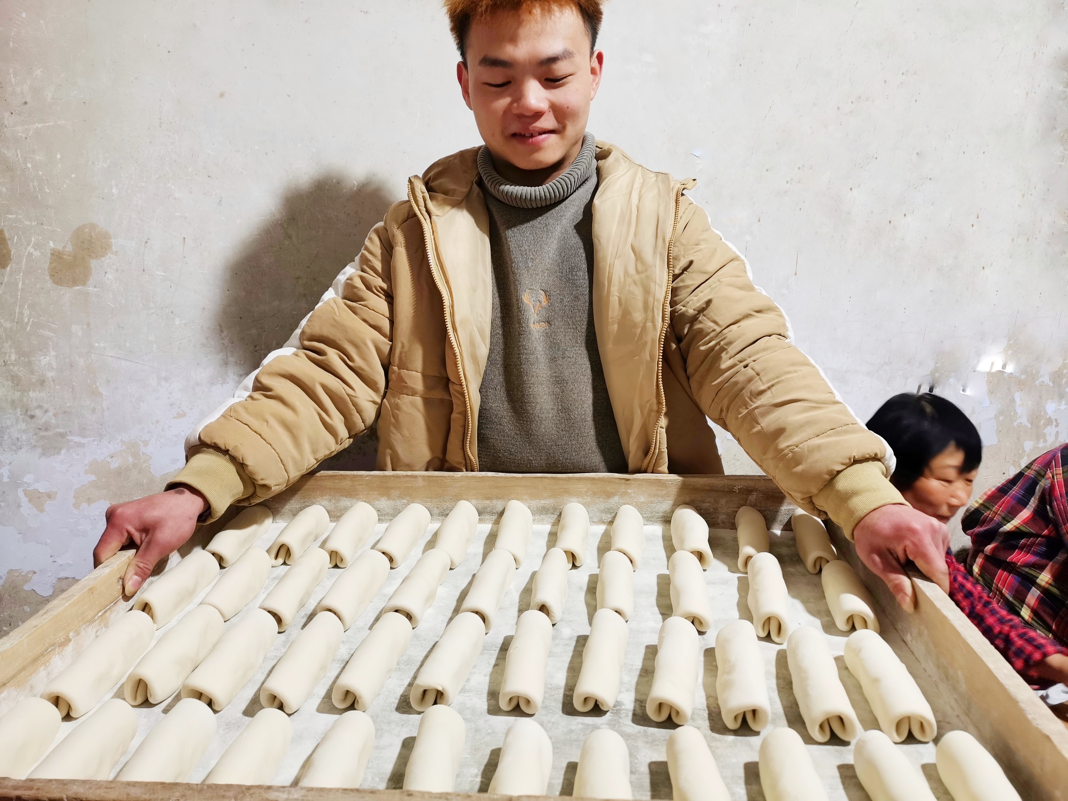 黃家手工杠子饃店,小黃展示剛卷好的杠子饃,即將進蒸箱