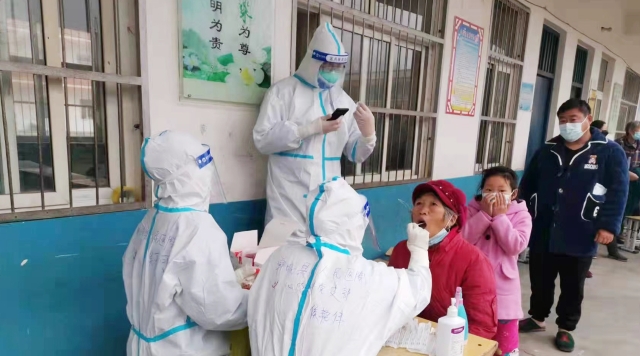 3月25日夜,天空下著小雨,李碧瑩和同事們乘車到市衛(wèi)生健康委員會(huì)集合,與其他醫(yī)院的50多名同仁一道,凌晨4點(diǎn)從周口出發(fā),早上7點(diǎn)到達(dá)太康,簡(jiǎn)單吃點(diǎn)早餐后,便開始緊張的核酸檢測(cè)采集工作。