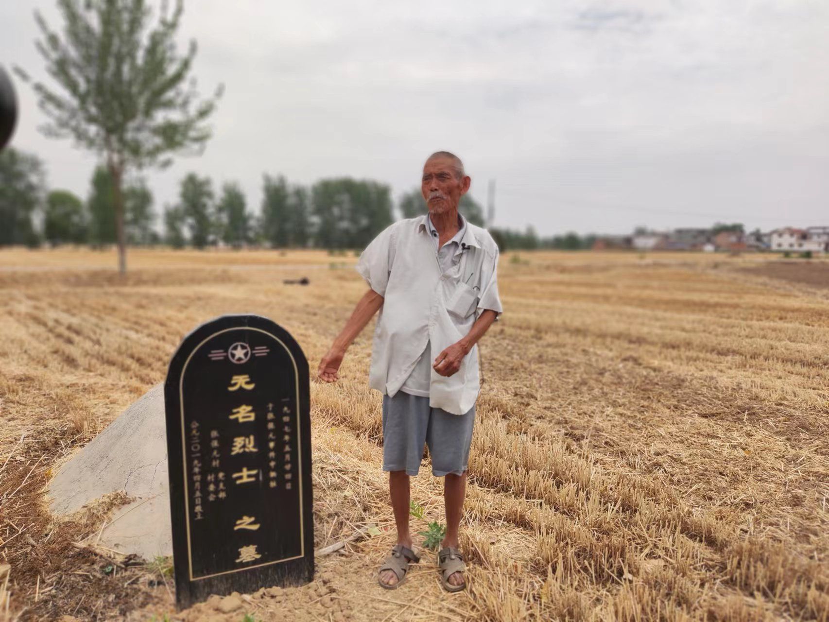 在87歲老人張金堯帶領(lǐng)下,記者一行來(lái)到了這位“小八路”的墳地。墳地位于緊鄰張保園的小郭莊行政村的莊稼地里。長(zhǎng)眠于此的這位“小八路”,墓碑上沒(méi)有遺像,沒(méi)有生平記載,僅有“一九四七年五月廿四日(陰歷)張保園事件中犧牲”“無(wú)名烈士之墓”就是他的全部。