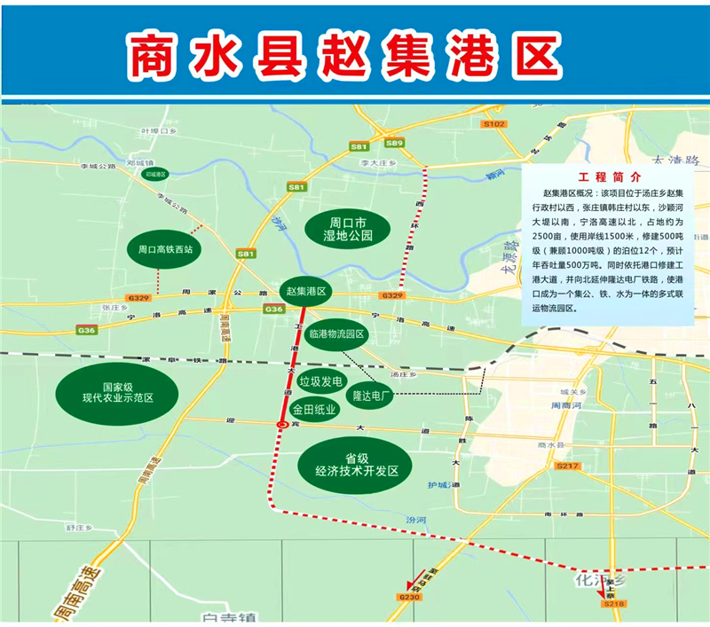 2017年,商水縣政府按照前瞻30年、謀劃15年、做實近5年工作要求,開始規(guī)劃修建位于湯莊鄉(xiāng)趙集行政村以西,張莊鎮(zhèn)韓莊村以東,沙潁河大堤以南,寧洛高速以北的趙集作業(yè)區(qū)。規(guī)劃建設占地約720畝、總投資6.37億元的趙集港項目,同時修建12個1000噸級泊位,其中散貨泊位8個,通用泊位2個,多用途泊位2個,占用岸線1250米,預計年吞吐量達475萬噸。碼頭采用順岸式布置,結構采用重力式扶壁結構,前沿配置30噸門座式固定吊裝卸作業(yè)。港口涵蓋貨物拆解區(qū)、散件堆放區(qū)等4個功能區(qū),集裝箱露天堆場、大型貨車停車場等5個場地。圍繞趙集港,高標準規(guī)劃建設占地約6.2平方公里的多式聯(lián)運臨港經(jīng)濟園區(qū),下設金田紙業(yè)、建材倉儲兩個物流園區(qū),涵蓋建材及建材制品園區(qū)、造紙業(yè)原料及成品園區(qū)、紡織服裝原料及成品園區(qū)3個功能園區(qū)。該項目建成投入使用后,不但能加快商水縣紡織園區(qū)、循環(huán)園區(qū)、經(jīng)濟開發(fā)區(qū)、隆達電廠等企業(yè)物質的流轉,而且能使商水港成為周口沙潁河重要的鐵運、陸運、水運交通樞紐、貨物貿易和物流中轉聚集區(qū),從而進一步促進商水經(jīng)濟的健康、快速發(fā)展。