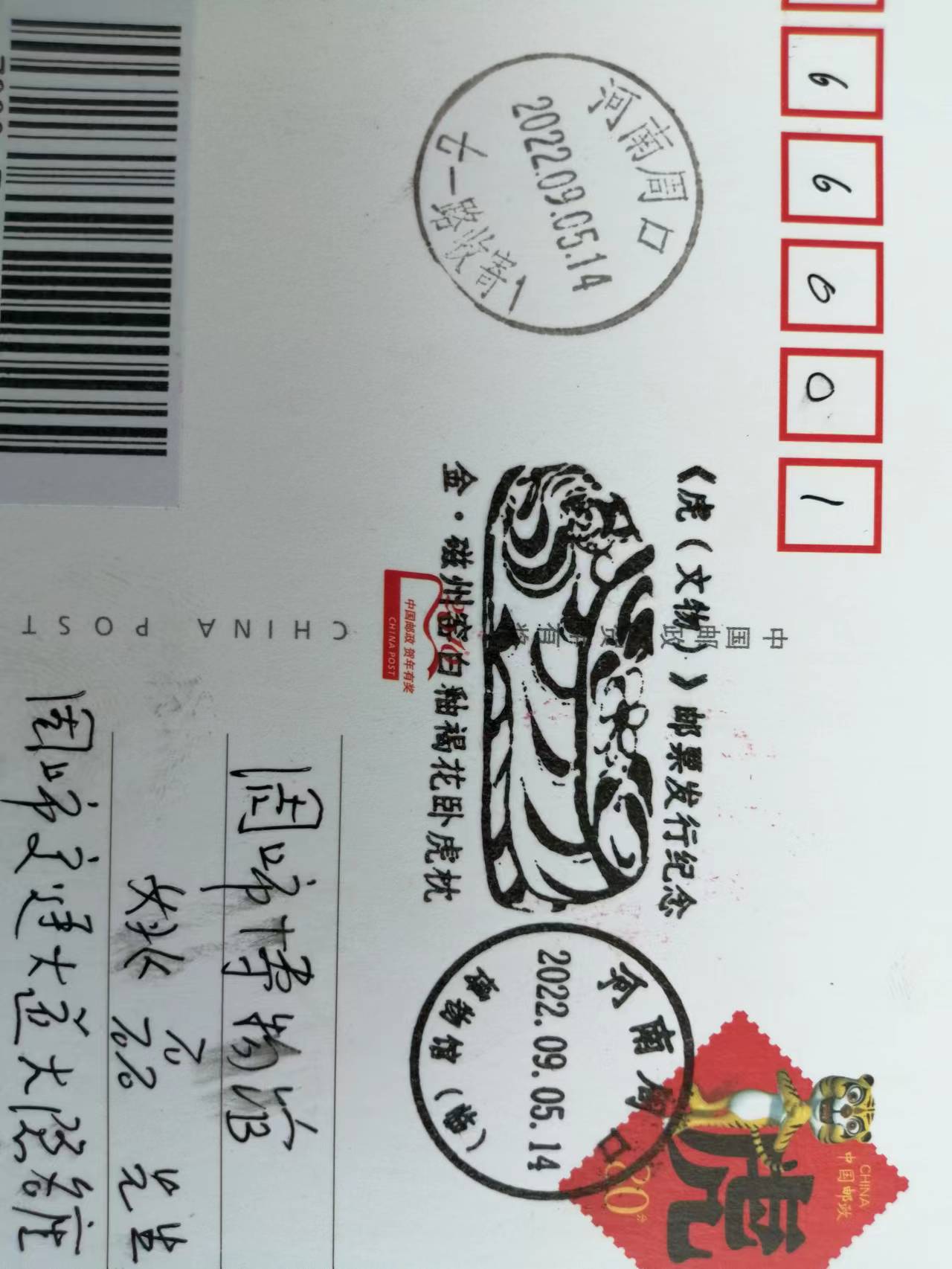 9月5日,由中國(guó)郵政特別制作的《虎文物》特種郵票正式發(fā)行。此套郵票共有6枚,每枚上都印有一件珍貴的虎文物。郵票圖案名稱分別為“商·伏鳥雙尾青銅虎”“春秋·青玉虎形佩”“漢·白虎瓦當(dāng)”“漢·錯(cuò)金銘文銅虎節(jié)”“金·磁州窯白釉褐花臥虎枕”“清·皮影飛虎”。其中第五枚郵票圖案中的“金·磁州窯白釉褐花臥虎枕”就是來自周口市博物館的珍貴文物,該郵票運(yùn)用光油和浮雕擊凸工藝,塑造了虎安詳、可愛的形象。