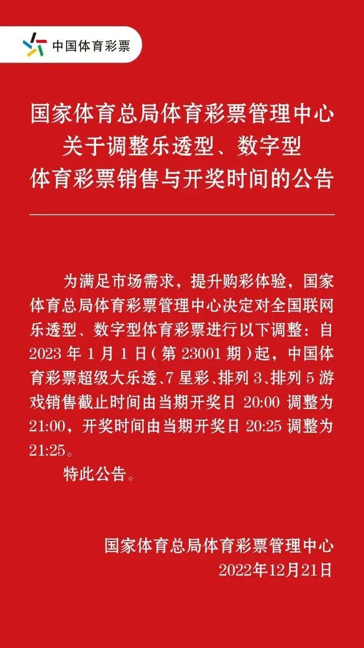 1月1日(第23001期)起,大樂透、7星彩、排列3、排列5游戲銷售截止時(shí)間由當(dāng)期開獎日20:00調(diào)整為21:00,開獎時(shí)間由當(dāng)期開獎日20:25調(diào)整為21:25。購彩者可通過電視、廣播、網(wǎng)站、手機(jī)客戶端、報(bào)紙等渠道查閱開獎信息。