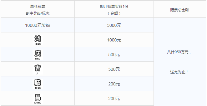 活動(dòng)期間,購彩者在我省任一體彩銷售實(shí)體店購買指定活動(dòng)票種,若單張彩票刮中符合獎(jiǎng)勵(lì)條件的獎(jiǎng)級(jí)或標(biāo)志,經(jīng)實(shí)體店終端兌獎(jiǎng)設(shè)備成功完成獎(jiǎng)金兌付(如中獎(jiǎng))及促銷兌獎(jiǎng)掃描后,即可獲得即開票贈(zèng)票獎(jiǎng)品一份??傤~有限,送完為止,詳見下表: