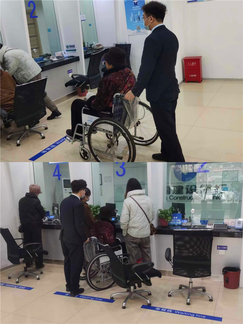 3月27日上午11點(diǎn)左右,項(xiàng)城蓮花大道支行大堂經(jīng)理張?jiān)评谠陂T口引導(dǎo)客戶時(shí),發(fā)現(xiàn)兩位客戶扶著另一位客戶走進(jìn)網(wǎng)點(diǎn)。注意到客戶雙腿行走不便,他立即推來(lái)輪椅,把客戶扶到輪椅上。三位客戶不熟悉銀行辦業(yè)務(wù)流程,大堂經(jīng)理張?jiān)评谌谈S指導(dǎo)辦理業(yè)務(wù)。經(jīng)詢問(wèn),大堂經(jīng)理得知客戶前來(lái)辦理社??せ顦I(yè)務(wù),以便領(lǐng)取殘疾人補(bǔ)貼。大堂經(jīng)理立即幫他安排綠色通道,幫助家屬推輪椅到柜臺(tái)辦理,在一旁指導(dǎo)客戶填單跟簽名。