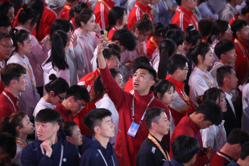閉幕式上,來自全省各地的運(yùn)動(dòng)員用手機(jī)記錄下精彩瞬間。記者 劉俊濤 攝