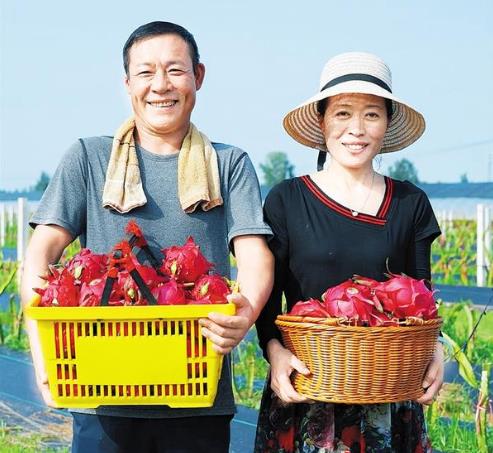 盛夏時(shí)節(jié),萬(wàn)木蔥蘢。在太康縣清集鎮(zhèn)夢(mèng)里田園火龍果種植基地,一株株仙人掌狀的火龍果成行排列,一個(gè)個(gè)飽滿的火龍果如火焰般垂掛枝頭。打扮利落的劉秀英邊用手機(jī)拍攝火龍果果皮上黃綠相間的鱗狀花萼,邊向粉絲介紹火龍果的長(zhǎng)勢(shì)和收成情況。