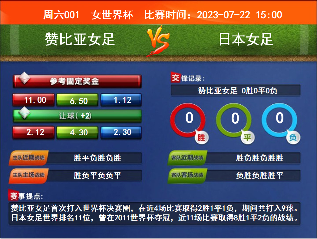 比賽時(shí)間:2023-07-22 15:00賽事提點(diǎn):贊比亞女足首次打入世界杯決賽圈,在近4場(chǎng)比賽取得2勝1平1負(fù),期間共打入9球。日本女足世界排名11位,曾在2011世界杯奪冠,近11場(chǎng)比賽取得8勝1平2負(fù)的戰(zhàn)績(jī)。