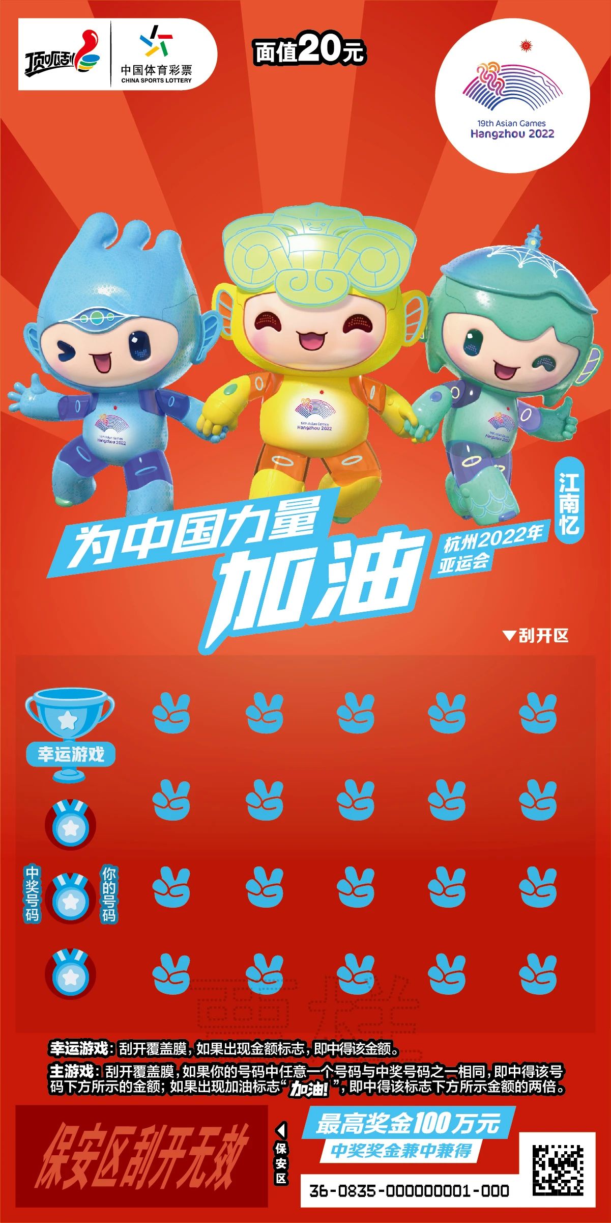 在杭州亞運會開幕倒計時200天之際,浙江體彩推出“為中國力量加油”杭州亞運會主題即開型體育彩票,票面以亞運會吉祥物“琮琮”“蓮蓮”“宸宸”為主體形象,將具有親和力的吉祥物與充滿活力的網(wǎng)球、游泳、籃球、乒乓球等體育運動相結(jié)合,以動感時尚形式展示亞運會賽事項目。