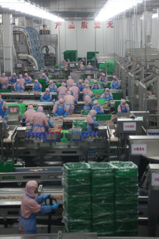 宰殺廠房的燈光比掛雞處的更暗了,除了星星點點的監(jiān)控?zé)艄猓瑤缀蹩床坏桨子鸹铍u的運動軌跡。僅僅一步之遙,進(jìn)入打毛間和掏膛間,白羽雞進(jìn)行退毛,去頭和去爪后,等待清潔預(yù)冷和被精準(zhǔn)分割為雞腿、雞翅、雞胸肉等產(chǎn)品。