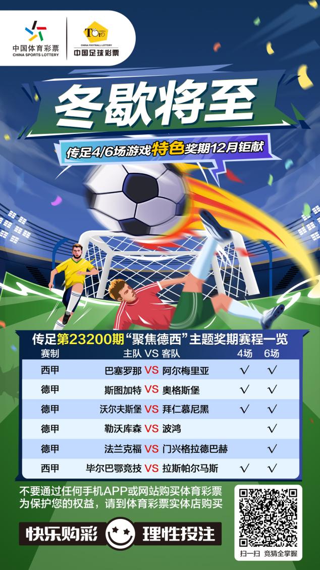 第23200期傳足特色獎(jiǎng)期已經(jīng)于12月17日20:00開售,將于12月20日22:00停售,并于12月21日開獎(jiǎng)。其中沃爾夫斯堡VS拜仁慕尼黑、斯圖加特VS奧格斯堡、巴塞羅那VS阿爾梅里亞和畢爾巴鄂競技VS拉斯帕爾馬斯為4場進(jìn)球游戲競猜賽事。