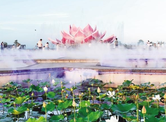 7月3日傍晚,淮陽龍湖荷花苑里,前來乘涼的市民絡繹不絕。在一朵粉紅色的荷花造型景觀周圍,噴泉映光影、水霧繞碧荷,如夢如幻,宛如仙境。