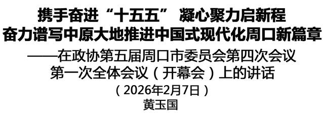 在“十四五”勝利收官、“十五五”開局起步的關(guān)鍵時(shí)期,政協(xié)第五屆周口市委員會(huì)第四次會(huì)議隆重開幕了。這是全市人民政治生活中的一件大事,是廣納群言、廣集眾智、共謀發(fā)展的一次盛會(huì)。在此,我代表中共周口市委,向大會(huì)的召開表示熱烈祝賀,向全體政協(xié)委員和與會(huì)同志致以誠摯問候!