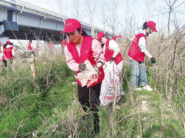 3月22日,志愿者在沙潁河畔撿拾垃圾。當日,67名來自周口市環(huán)境保護協(xié)會、周口師范學(xué)院、周口恒大中學(xué)的環(huán)保志愿者,在中心城區(qū)沙潁河畔開展“世界水日、中國水周,護河凈灘在行動”活動,以實際行動踐行“綠水青山就是金山銀山”理念。