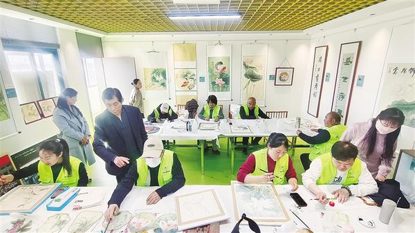 近日,淮陽區(qū)王店街道王樓村村民在美術(shù)老師的指導(dǎo)下畫荷花。作為遠近聞名的“畫荷村”,王樓村一直延續(xù)著畫荷花的傳統(tǒng)。農(nóng)閑時,村民經(jīng)常在老師的指導(dǎo)下學(xué)習(xí)繪畫技巧,將鄉(xiāng)村生活的恬靜與荷花的靈動融入筆墨之間。