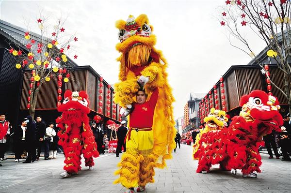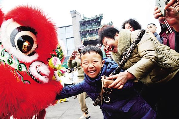 1月22日,孩子和“獅子”親密接觸,既開心又緊張。當(dāng)日,隨著第二屆“三川十館·春會(huì)”開幕,處處洋溢著歡快的新年氛圍。