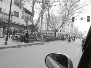 圖② 五一路與交通大道口東北角人行道成了“存車場”,行人只能繞行快車道。